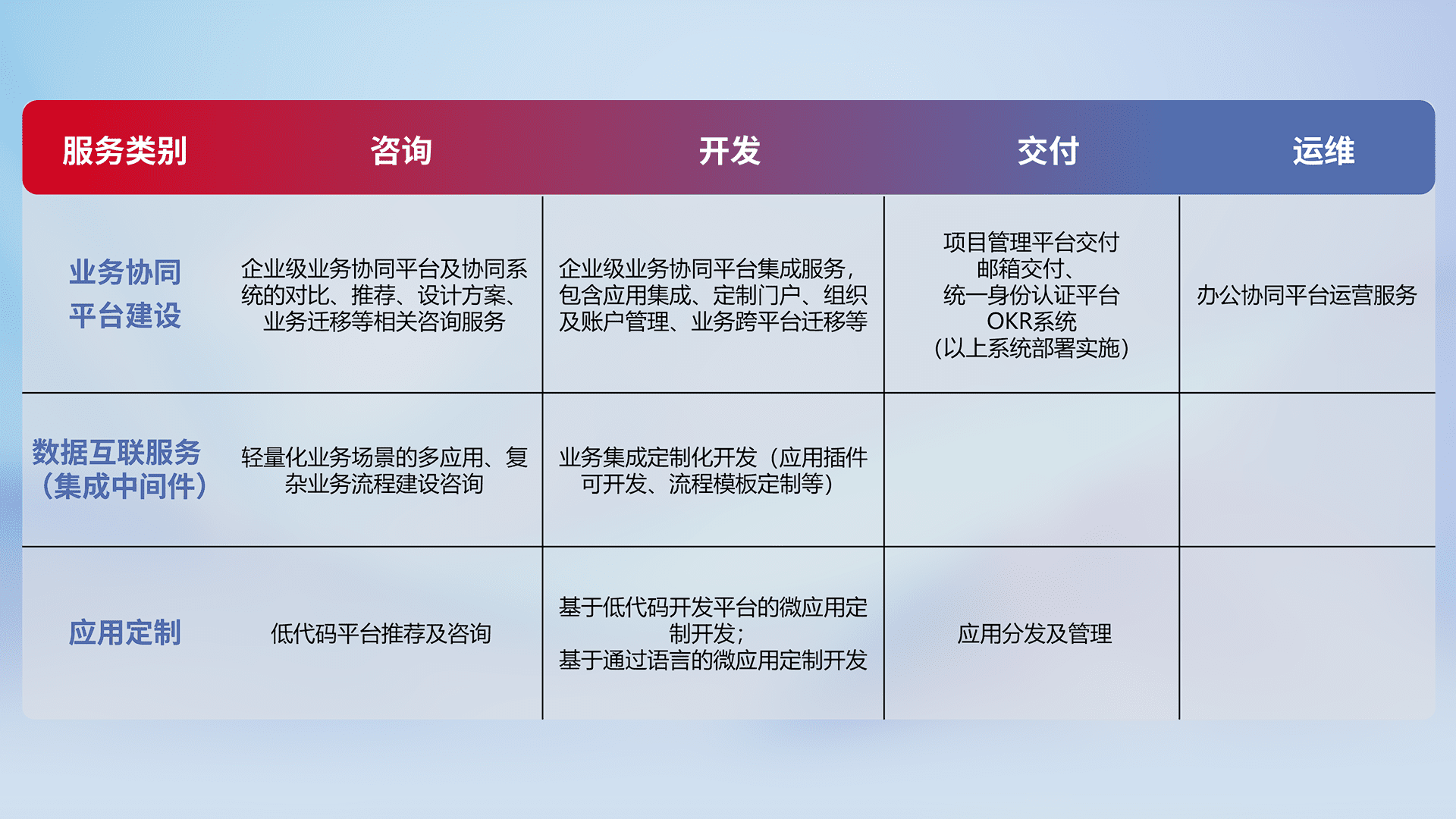 针对钉钉、、企微、、、、IDaas等平台级产品提供产品的规划、、、、方案、、、交付、、、、定制化开发等服务,,实现如统一协同办公、、、、智能客户服务、、、、混合会议管理、、、、智能数据查询、、等业务场景,,实现数字化转型。。。