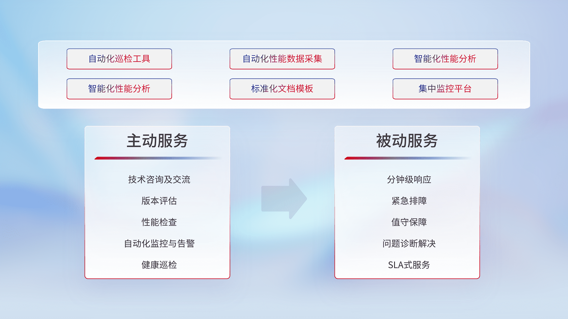 智能化工具和标准化文档,,,保障服务质量,,,,提供主动服务(包含技术咨询、、版本评估、、、性能检查、、自动化监控与告警、、健康巡检)和被动服务包含(分钟级响应、、、紧急排障、、、值守保障、、问题诊断解决、、、SLA服务)。。。。